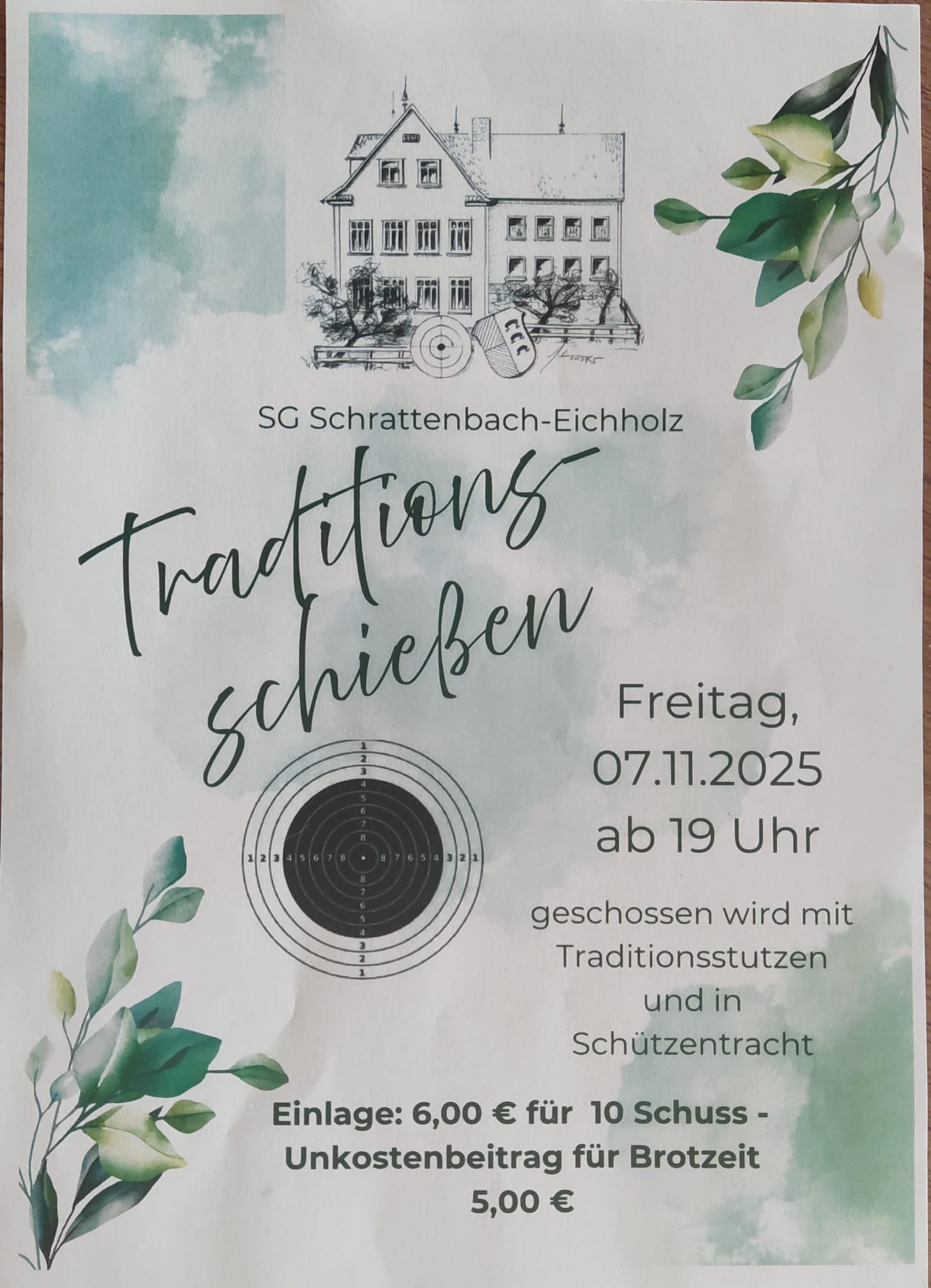 Heute Freitag, 07.11.2025, findet ab 19 Uhr unser Traditionsschießen statt. Es wird wie immer in Tracht und mit alten Stutzen geschossen. Der Ausschuss freut sich auf Euer Kommen.
